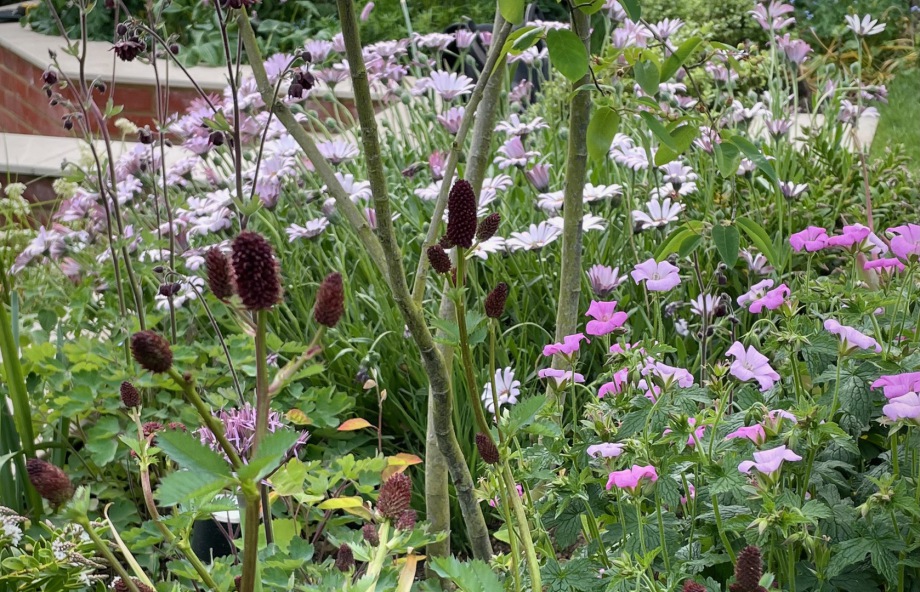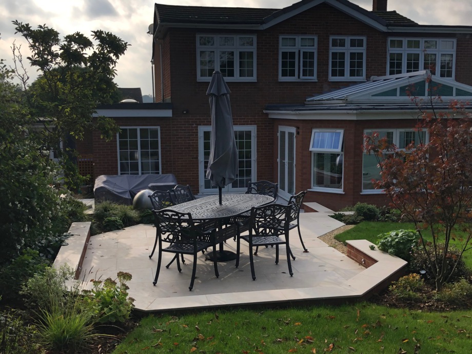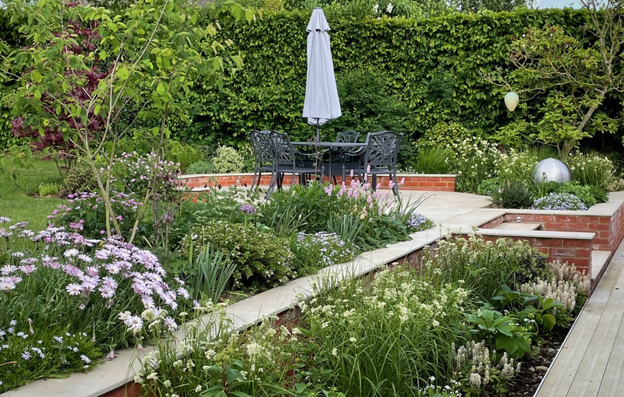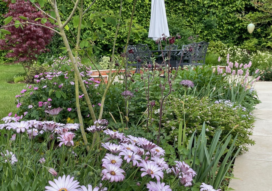 The area near to the property was divided into Zones for relaxing and dining. Deep borders allow for a range planting. Colours of pinks,whites and plum were requested by the client. Dimensions of diagonals within the existing property were repeated in the walling and were used in shaping the outside living areas. The overall intention was to create a country style garden with a contemporary feel.