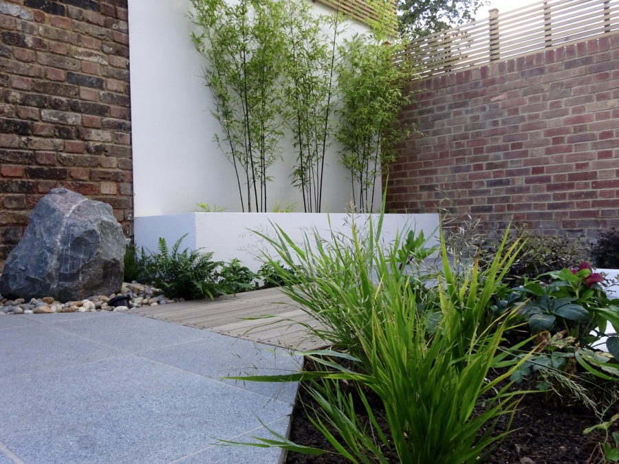 Japenese Planting, both evergreen and deciduous. Colour Is provided from a combination of flower and leaf. Prunus Amanogawa (flowering cherry) and Bamboo provide veritcal accents and specimen plants were selected for simplicity and impact. A narrow slatted wood path divides the space and bridges the two garden areas. It also complemented and repeated by the slatted wood fencing and seating in the garden and the internal flooring. Grey granite paving provides a clean contemporary feel and contrasts well with the painted white raised beds that also add an extra dimension of space.