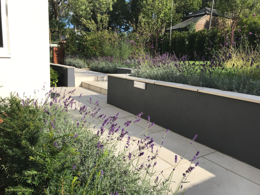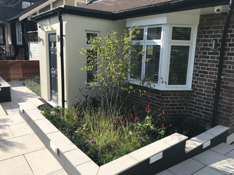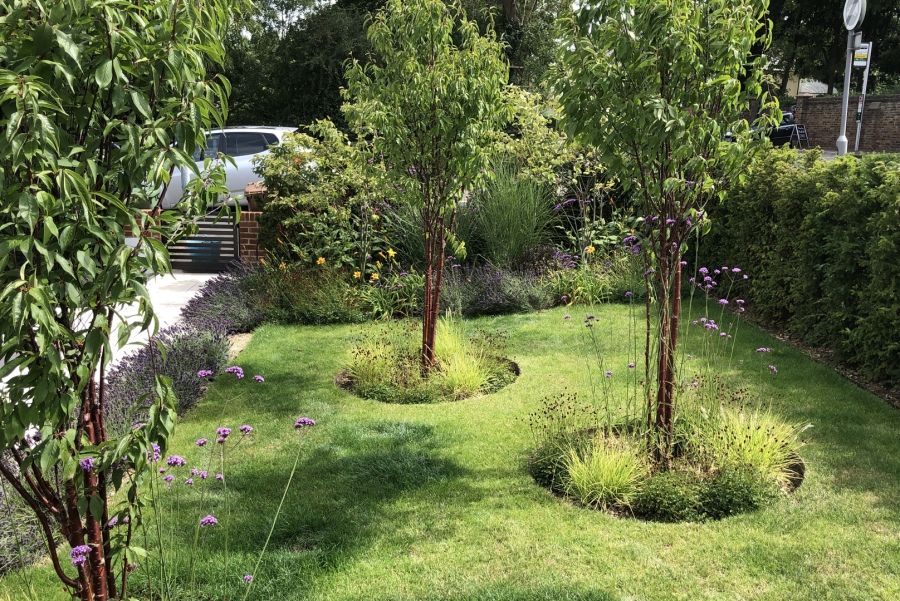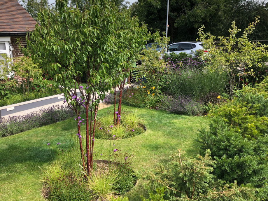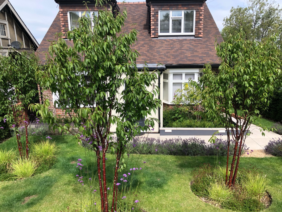 The clients required a front Garden with kerb appeal that also provided a green buffer and privacy between the house and road outside. Multi-stemed Prunus Serrula trees postioned centrally in front of the two bay windows and the front door have a dual purpose of providing interest from within and privacy from the outside world. Care was taken to ensure that planting reflected the bordering vegetation. This has therefore enabled the garden to feel grounded and settled within its location.