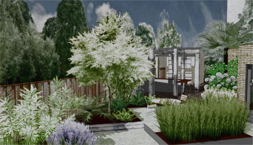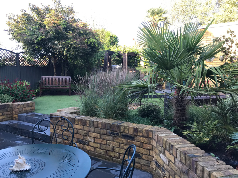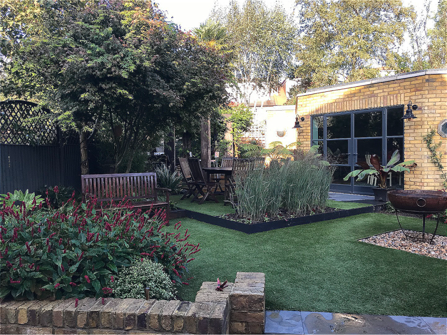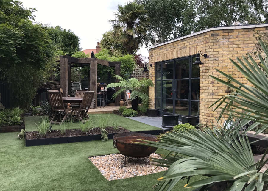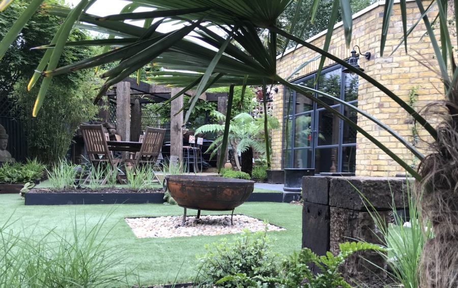 Compartments within this Town garden include, kitchen area and bar, secluded dining area and a Crash zone including a firepit. The garden has a tropical vibe with an emphasis on leaf colour and texture. The use of artifical grass was offset with deep borders of planting and enables the garden to be used 365 days of the year.