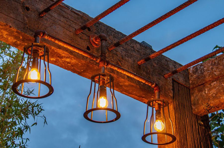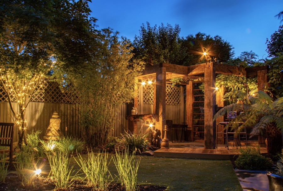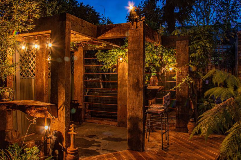 An old tree trunk was recycled for seating and bar tops within the kitchen pergola. A Budha and Monkeys add to the jungle theme. We have even managed to borrow the view of a large palm in a neighbouring garden.