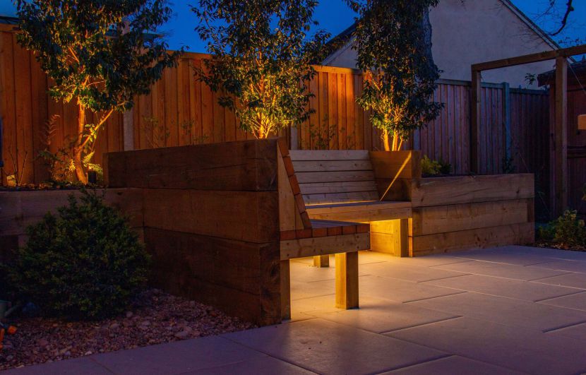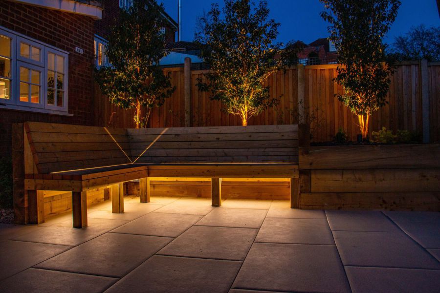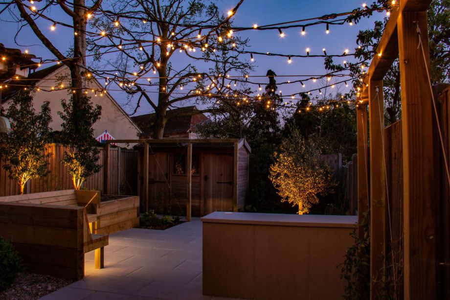 Removal of the shrubs allowed for a dining area that was in turn extended into the main garden area. Stainless steel wiring attached to wood posts provided privacy and allowed lighting to hung overhead. In time evergreen scented climbers will scramble along the wires.The BBQ worktop partitions the two spaces and allows for food to be served driectly to diners.