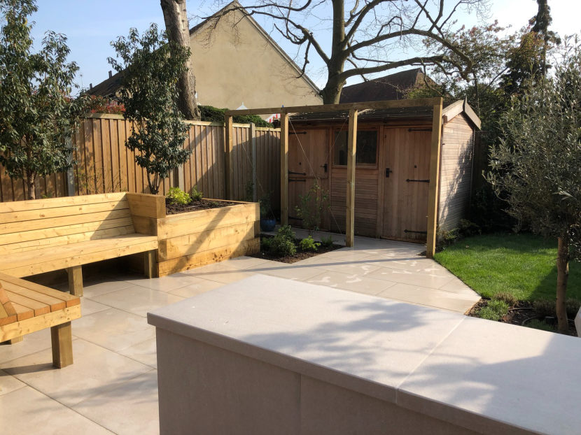 This garden was redesigned to make best use of the space. Large shrubs originally narrowed the entrance to the garden creating just a walkway that led to paved area with no interest. The clients wanted a garden for socialising with a built in BBQ area and fridge, a table and chairs for dining, a large seated area postioned for the afternoon sun, a small lawn for little feet and to hide the garden shed.