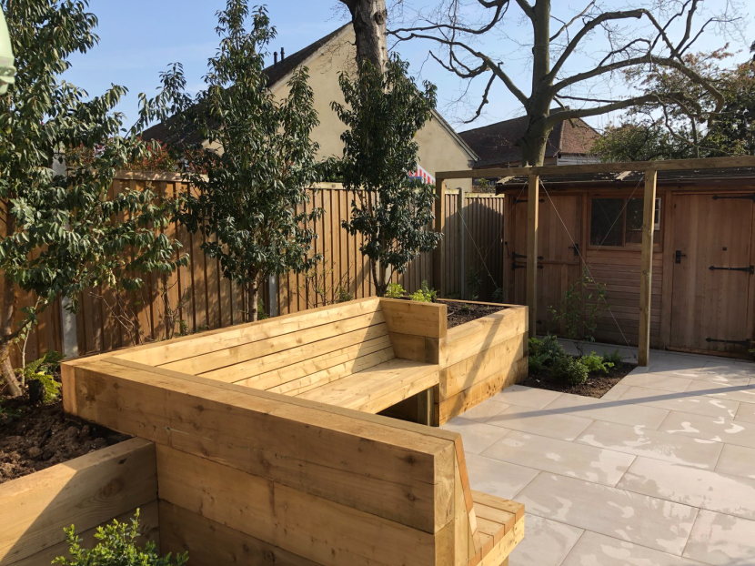 In the main section of the garden we created a bespoke L-shaped bench built within the raised bed. Large shrubs give privacy without taking any of the afternoon sun. Posts and wires were repeated allowing climbers to hide the shed behind. A feature Olive tree opposite the raised bed brings height and balance and also helps partition the lawn area beyond.