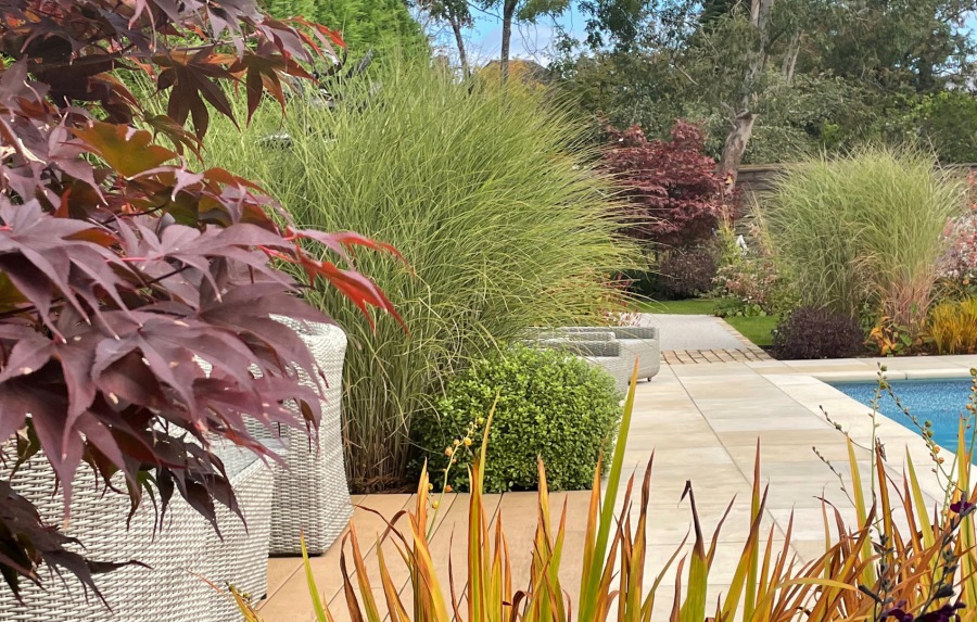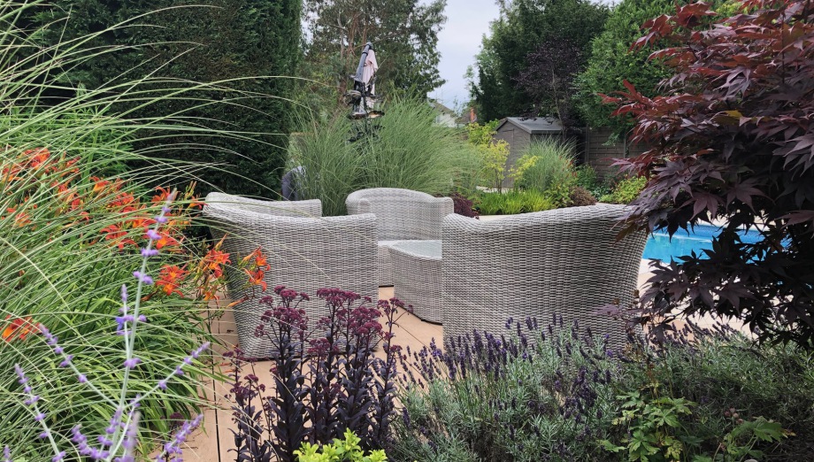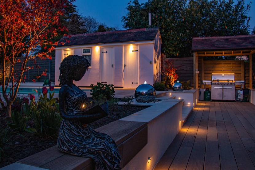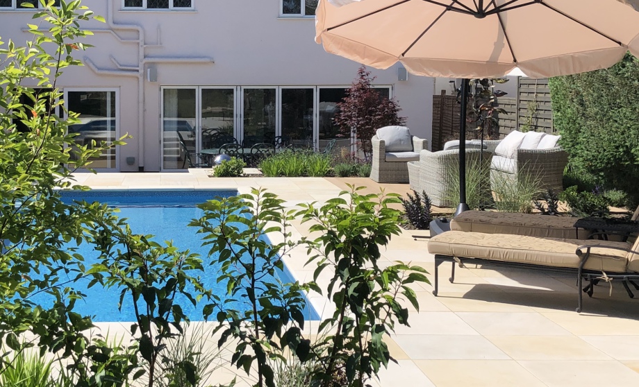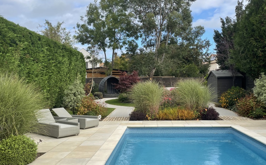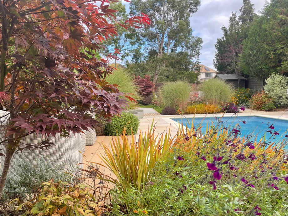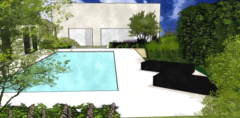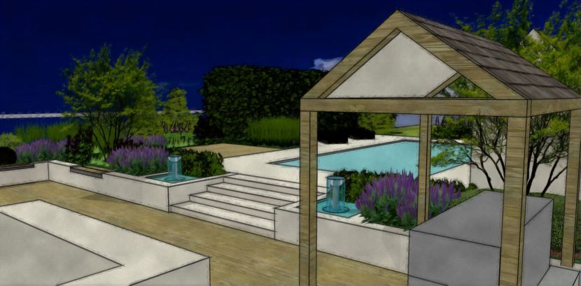 In this garden the pool takes centre stage, water features help bridge the lower and upper Areas. Entertaining/relaxing Zones provide mutliple options for use and a covered BBQ station mirrors the existing Pool house.