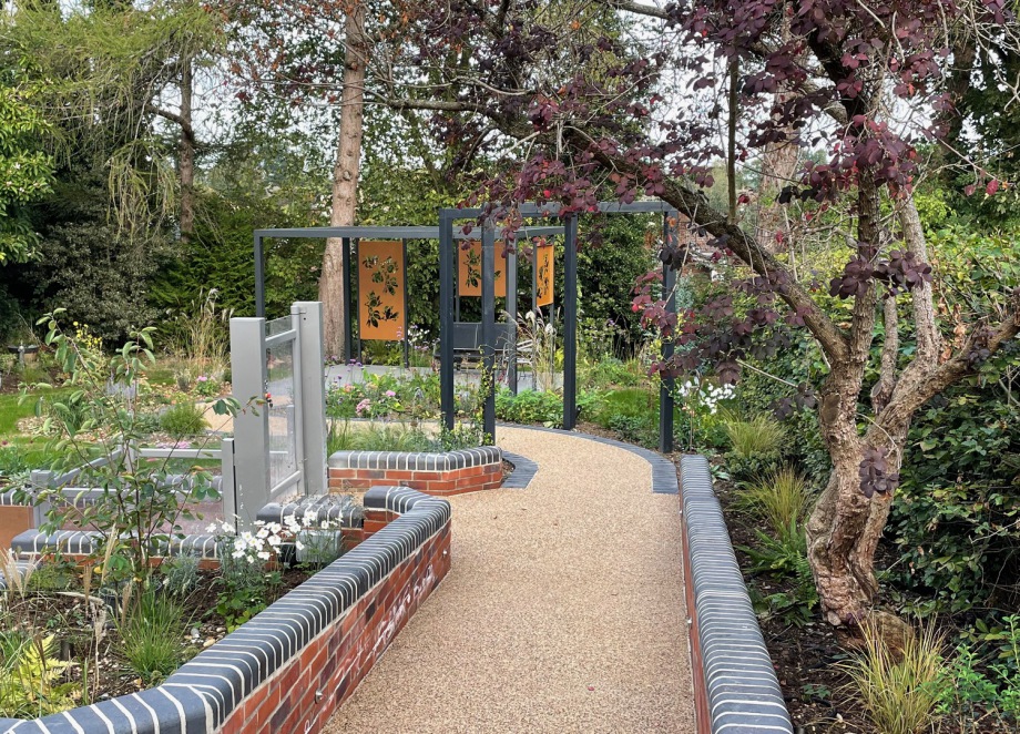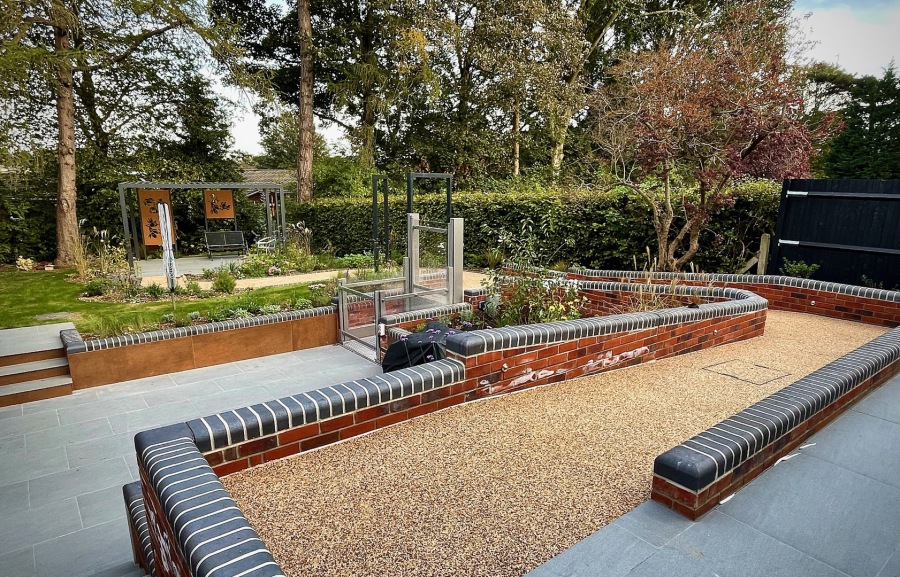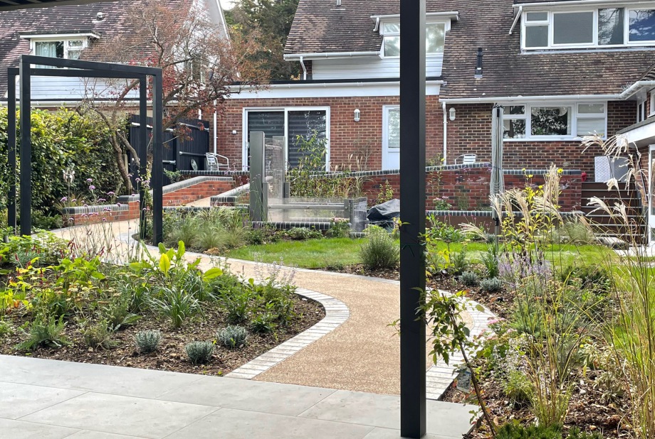 This garden had existing challenging level changes,especially for an assisted wheel chair user. Gentle level gradients were essential so we introduced ramps, a lift to a sunken terrace and a meandering path to a central bespoke pergola. The planting has only rently been completed. A mix of tactile grasses and colourful plants will provide scent,touch,movement, colour and attract wildlife.