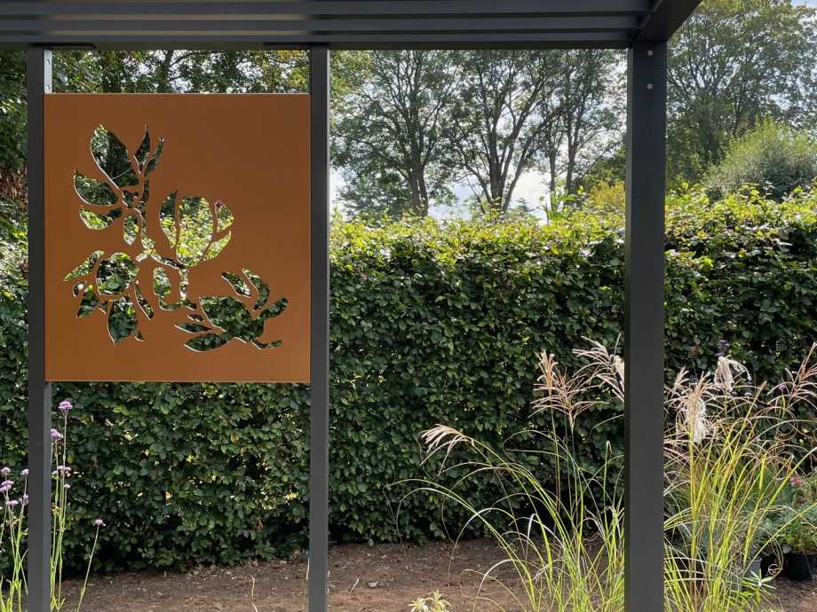 The corten coloured pannels are a bespoke design and depict the flowers from the clients favourite existing magnolia tree.
